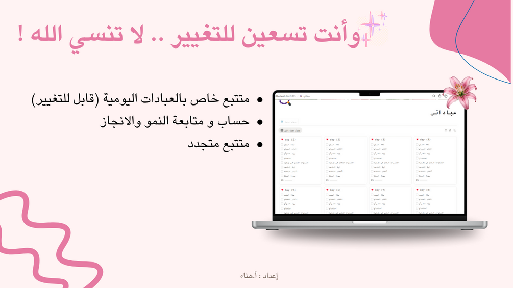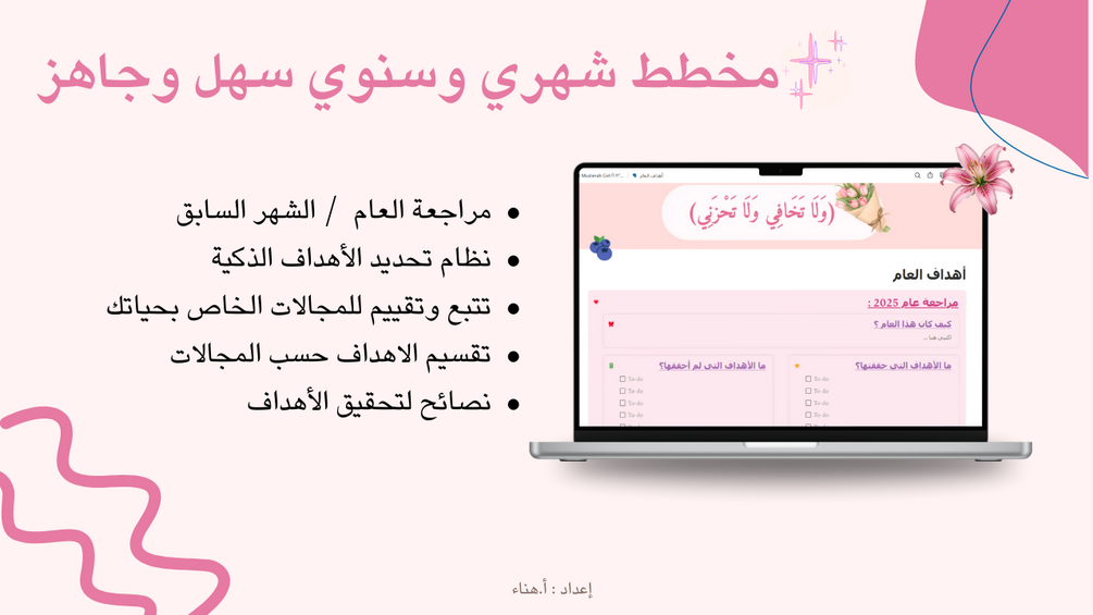 بلانر رقمي صُمّم خصيصًا للفتاة المسلمة، التي تبحث عن التوازن لا الكمال، وعن القرب من الله دون ضغط أو مثالية قاسية. هذا البلانر يجمع بين: الإيمان النفس الجسد الأهداف الوقت بطريقة تحترم الطبيعة الأنثوية وتقلّباتها. ✦ ماذا ستجدين داخله؟ تحديد نية ورؤية سنوية بروح إيمانية تنظيم العبادات بأسلوب لطيف غير مرهق صفحات للعناية النفسية والاحتواء العاطفي متابعة الجسد برفق دون أرقام أو جلد ذات تحديد أهداف واقعية تخدم الدنيا والآخرة تنظيم أسبوعي مرن يناسب طاقتك صفحات امتنان ورضا أقسام خاصة بالفتاة المسلمة (الدورة، الأنوثة، الراحة) ✦ لمن هذا البلانر؟ لكل فتاة مسلمة تشعر أن البلانرز التقليدية تضغطها لمن تريد التخطيط مع الله لا بعيدًا عنه لمن تبحث عن السكينة قبل الإنجاز That Muslimah Girl Planner ليس ليجعلكِ مثالية… بل ليذكّركِ أنكِ إنسانة، ومسلمة، وكافية 🤍